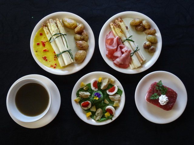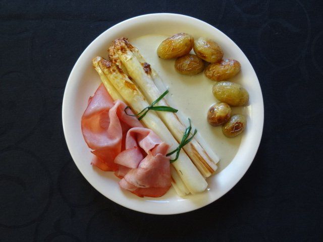 Geroosterde asperges van Meinardi oosterse botersaus en boeren achterham of