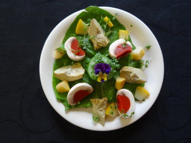 Salade met gegrilde artisjokken harten, ingelegde courgette, gevulde champignon en tuinkers